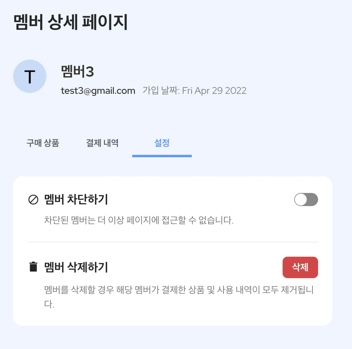 멤버 삭제는 멤버와 관련된 모든 정보(구매 상품 내역, 결제 내역)를 삭제합니다. 하지만 멤버가 다시 로그인을 시도하면 새로운 회원으로 가입이 가능합니다.