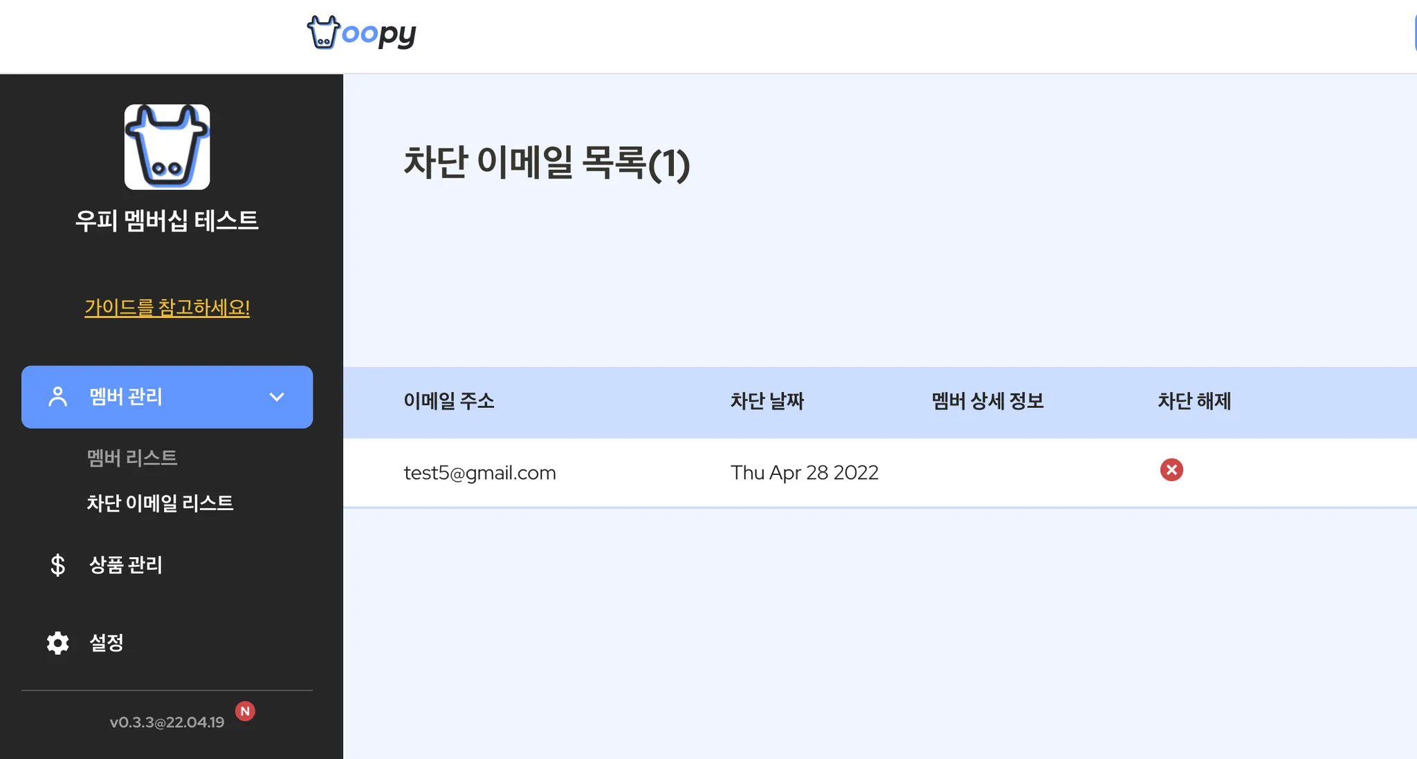 차단된 이메일 리스트를 확인하시려면 우피 멤버십 콘솔에서 멤버 관리 → 차단 이메일 리스트를 확인해 주세요. 혹은 아래 링크로 바로 들어갈 수 있습니다.
