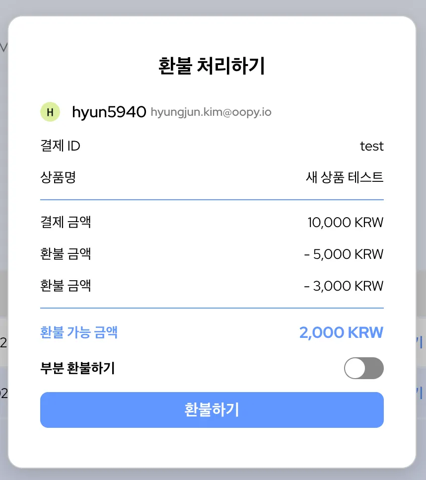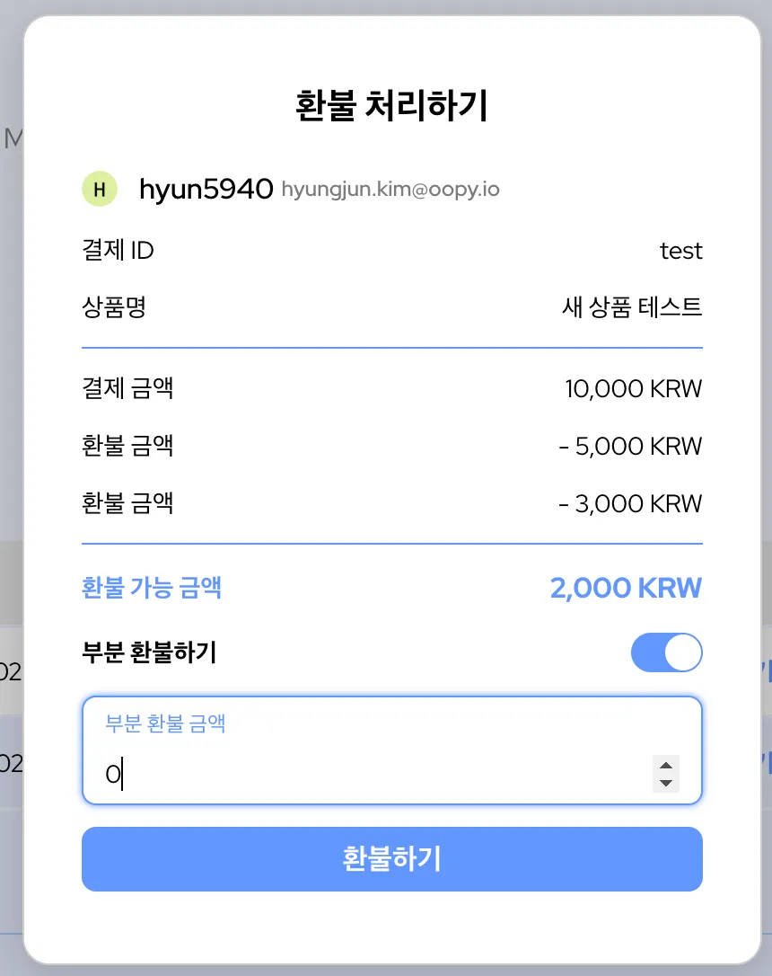 환불하기 버튼을 누르면 아래와 같이 환불을 진행할 수 있습니다.