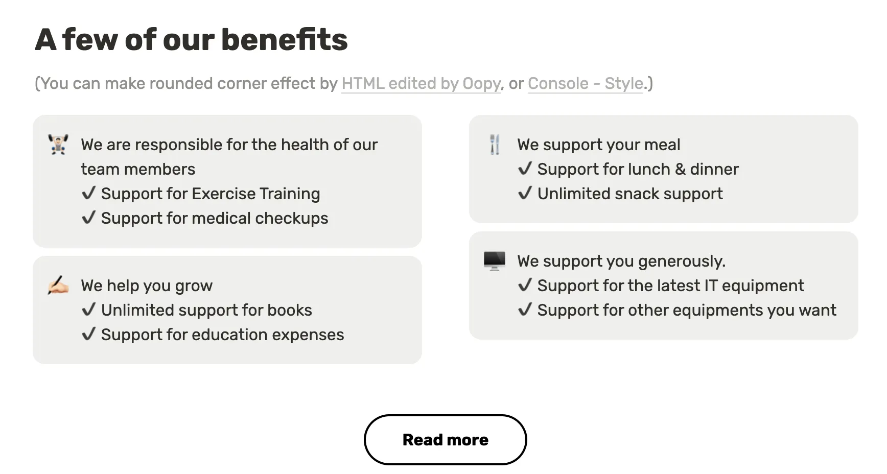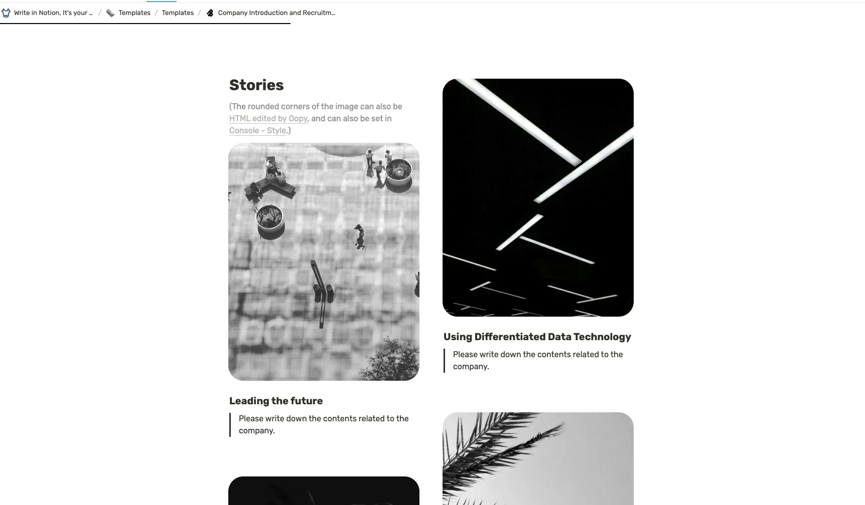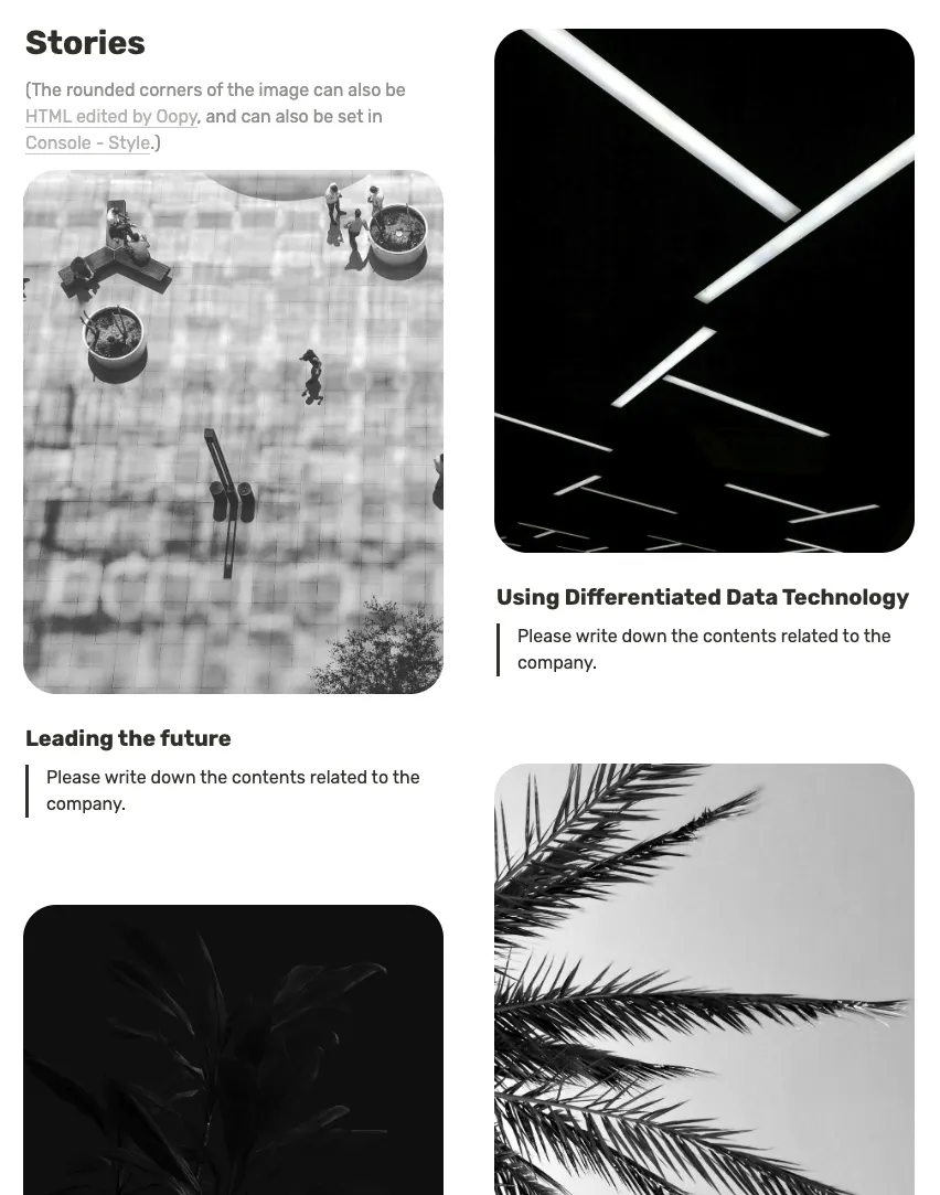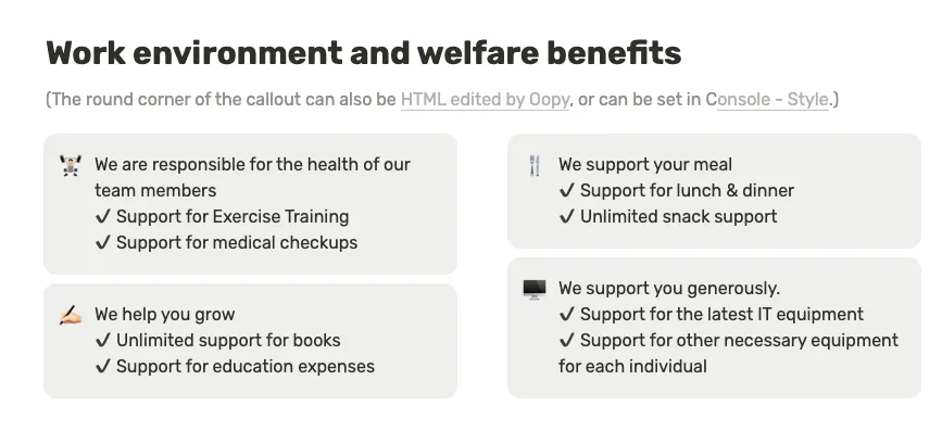 If you take a good look at the screenshots below, the images and callouts have rounded borders. You can round your borders through HTML code blocks or the Oopy console! Adjust the radius values to suit your company.