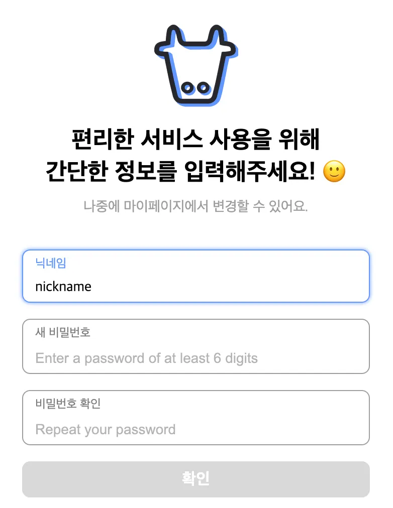 멤버 회원가입 완료 후 닉네임을 추가로 입력받아요