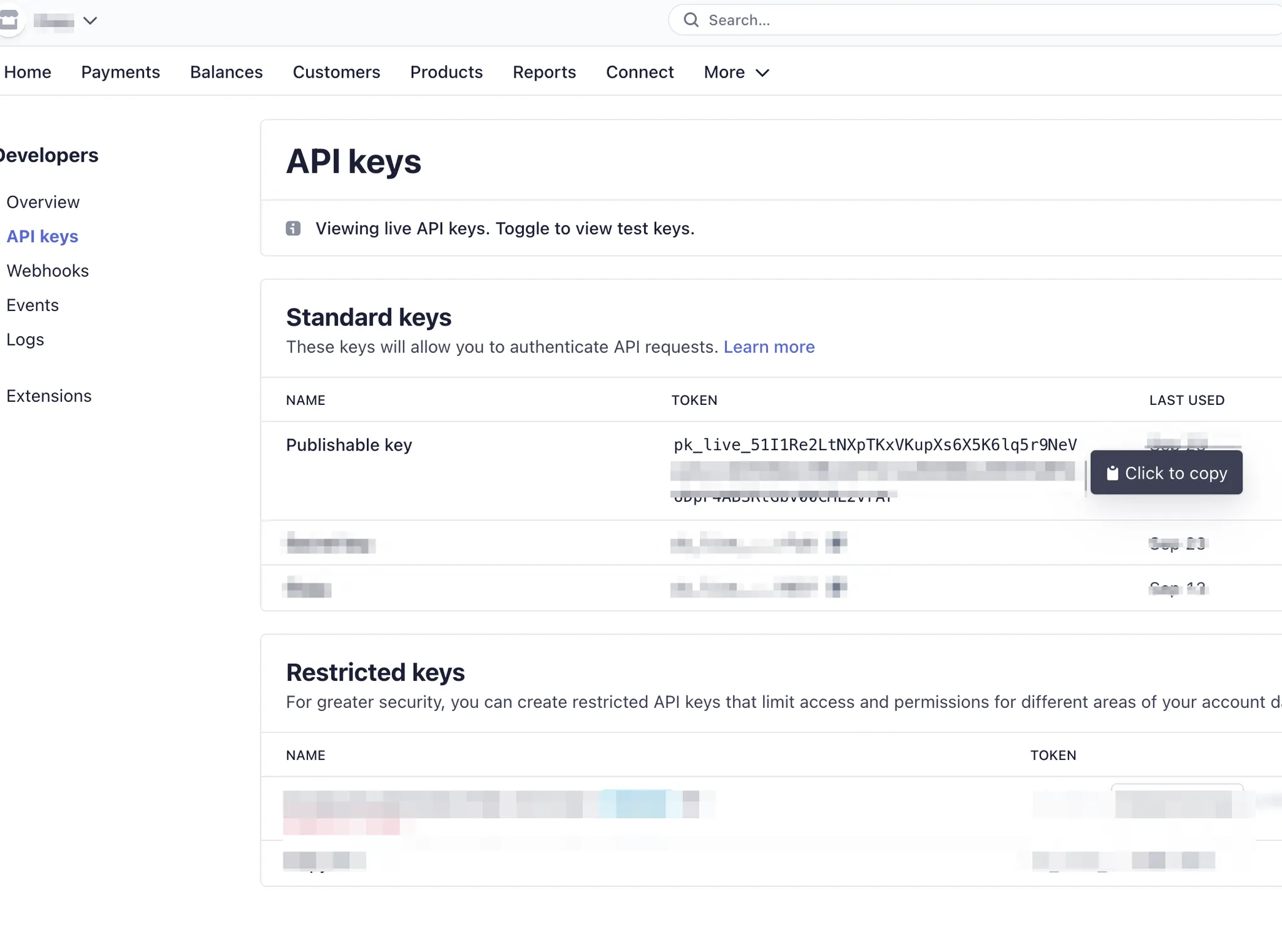 dashboard.strip.com ⇒ Developers ⇒ API keys ⇒ Restricted keys ⇒ Create restircted key