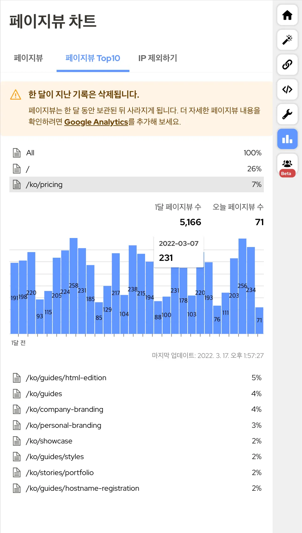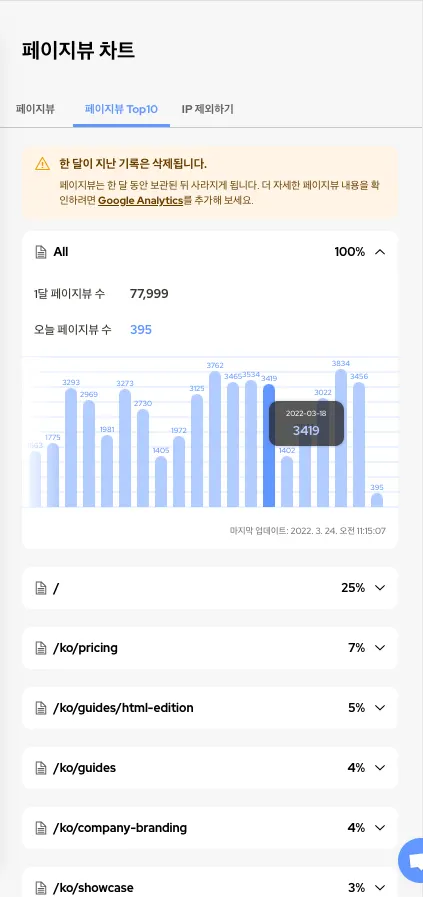 페이지뷰 차트의 막대 그래프의 모습과 페이지들의 모습도 조금 달라졌어요!