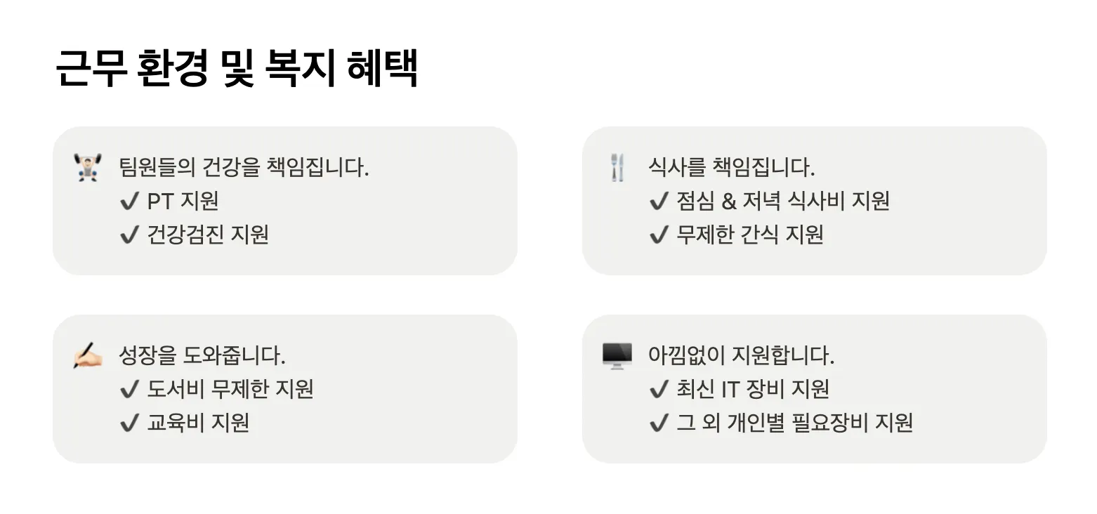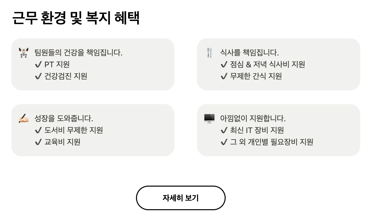 근무 환경 및 복지 혜택 섹션의 아래쪽을 보면 자세히 보기 버튼을 볼 수 있어요.