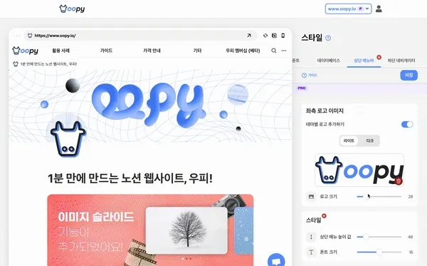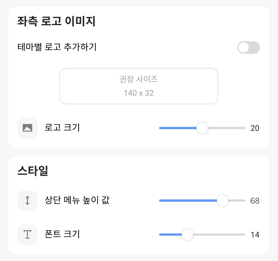 로고 크기, 상단 메뉴 높이 값, 폰트 크기를 조절할 수 있어요.