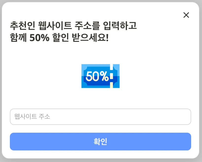 친구가 가입한 뒤 마이페이지에 들어가면 우측과 같은 화면을 보게 됩니다. 여기에 내 웹사이트 주소를 입력하도록 도와주세요! 무료 사용 기간이 끝난 후 친구가 첫 결제를 완료하면 쿠폰이 발급됩니다.