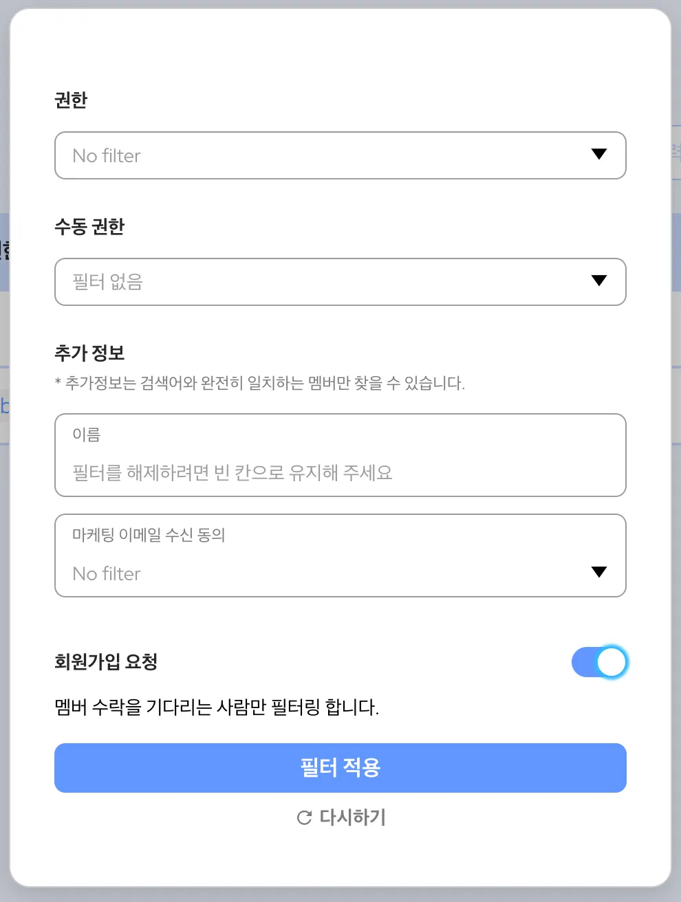 필터를 이용해 회원가입 요청 멤버만 확인해 보세요.