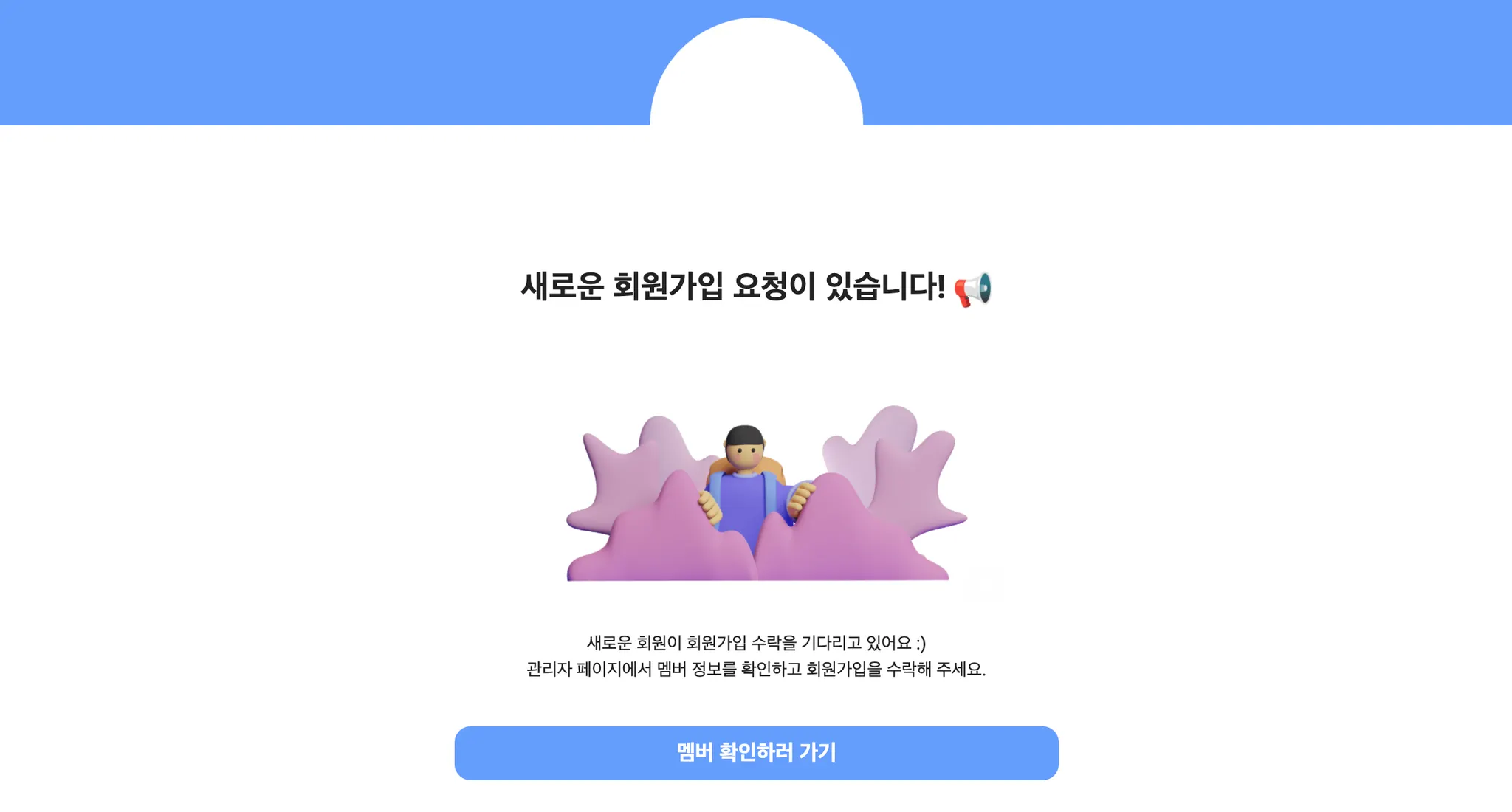 이메일의 멤버 확인하러 가기 버튼을 눌러 멤버 상세 페이지로 이동한 후, 해당 멤버의 이메일, 추가 정보 등을 확인하여 멤버 수락을 진행해 주세요.