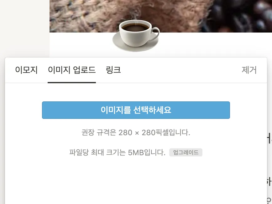 커피 이미지를 클릭하면 아래 그림처럼 내가 원하는 이미지를 업로드 할 수 있어요.