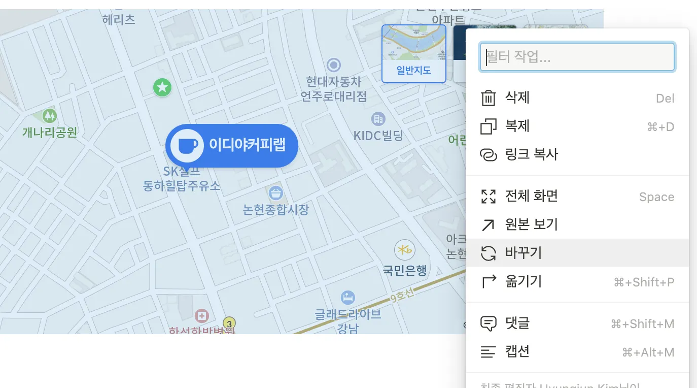 다시 템플릿으로 돌아와서 지도의 우측 상단에 있는 더보기 버튼 ... > 바꾸기 를 차례대로 눌러주세요. 여기에 복사해둔 네이버 지도 링크를 붙여넣기만 하면 우리가게 지도로 변경 성공!