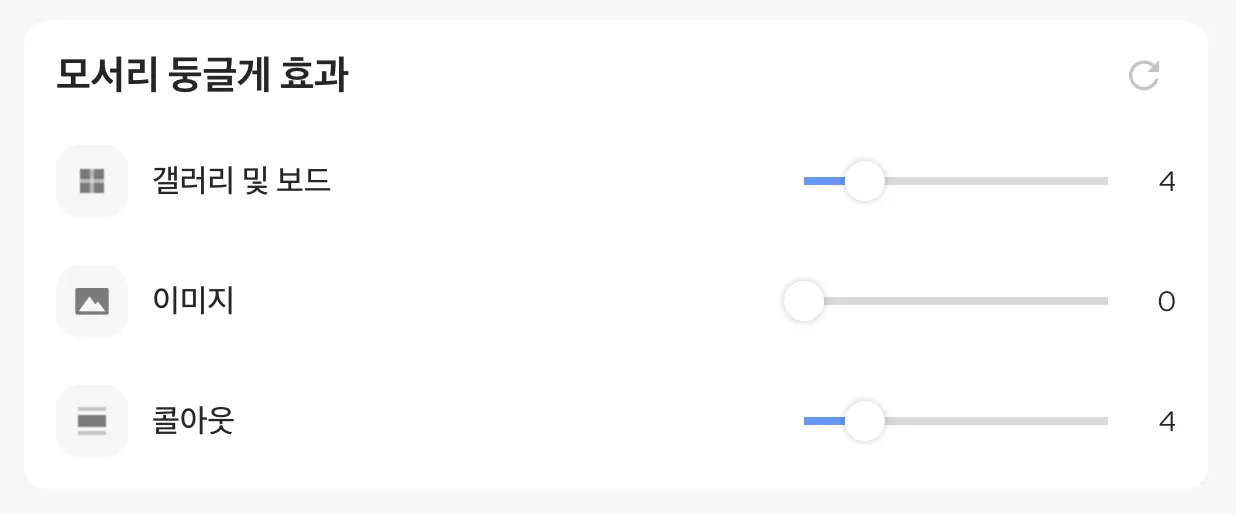 갤러리 및 보드, 이미지, 콜아웃에 0~20 까지 모서리를 둥글게 만드는 효과를 적용할 수 있어요.