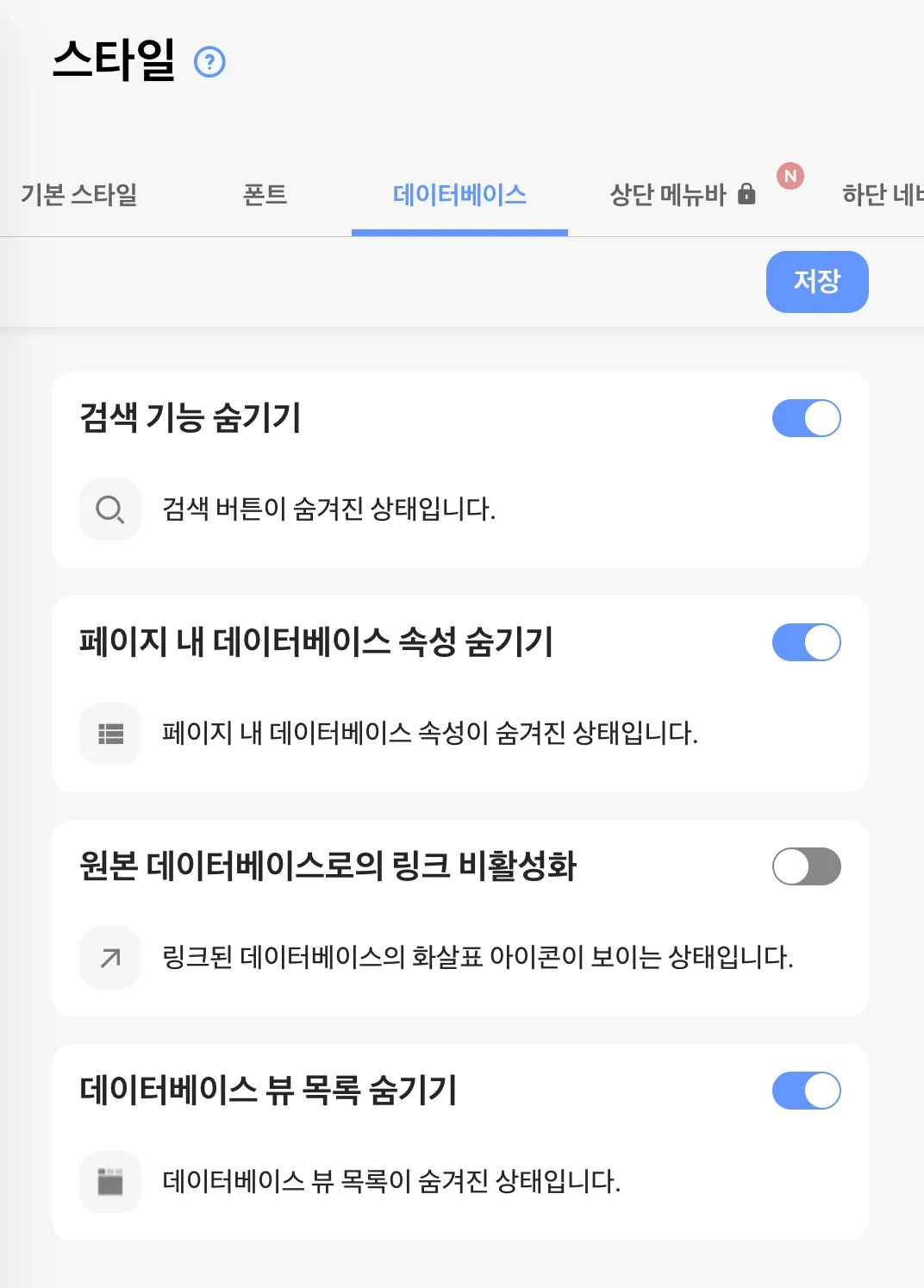 노션 원본에 보이는 검색 아이콘과 뷰 목록들이 데이터 베이스 스타일 적용한 이미지에서는 보이지 않아요!