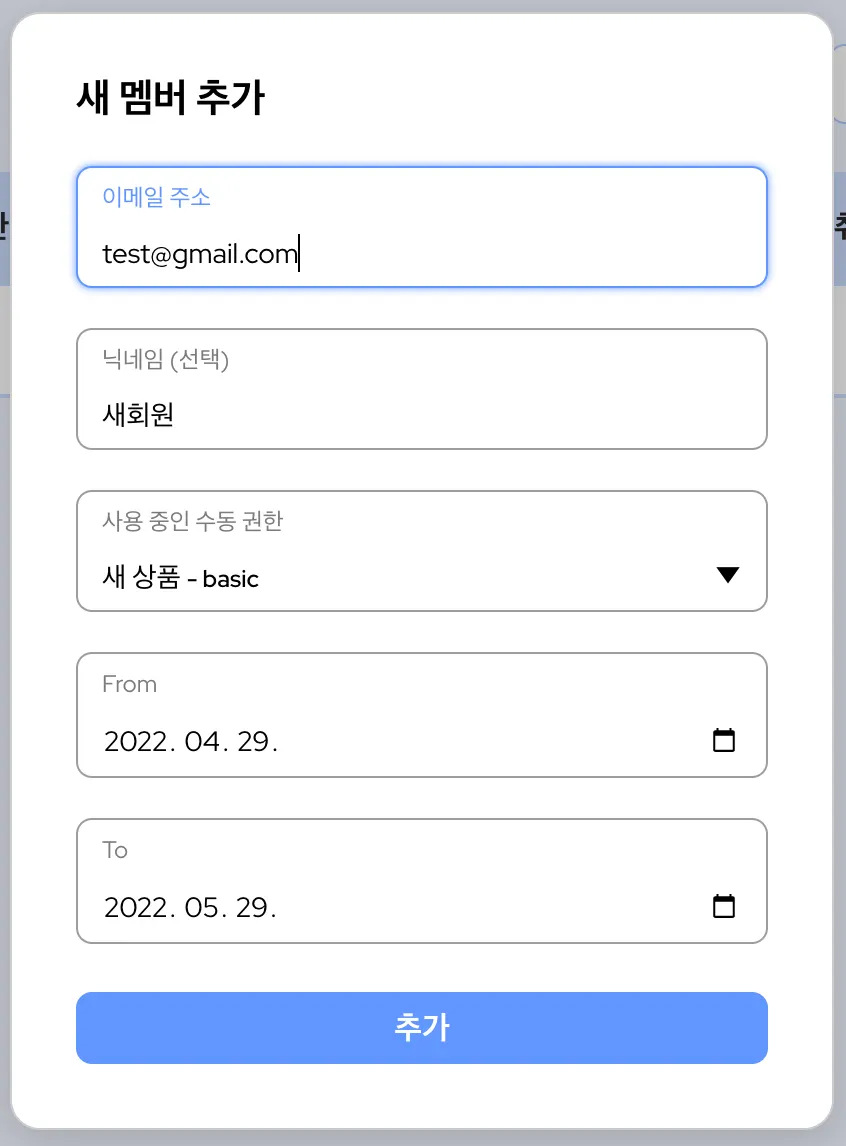 멤버의 이메일(필수)을 입력하고 닉네임 혹은 권한을 미리 부여할 수 있습니다.