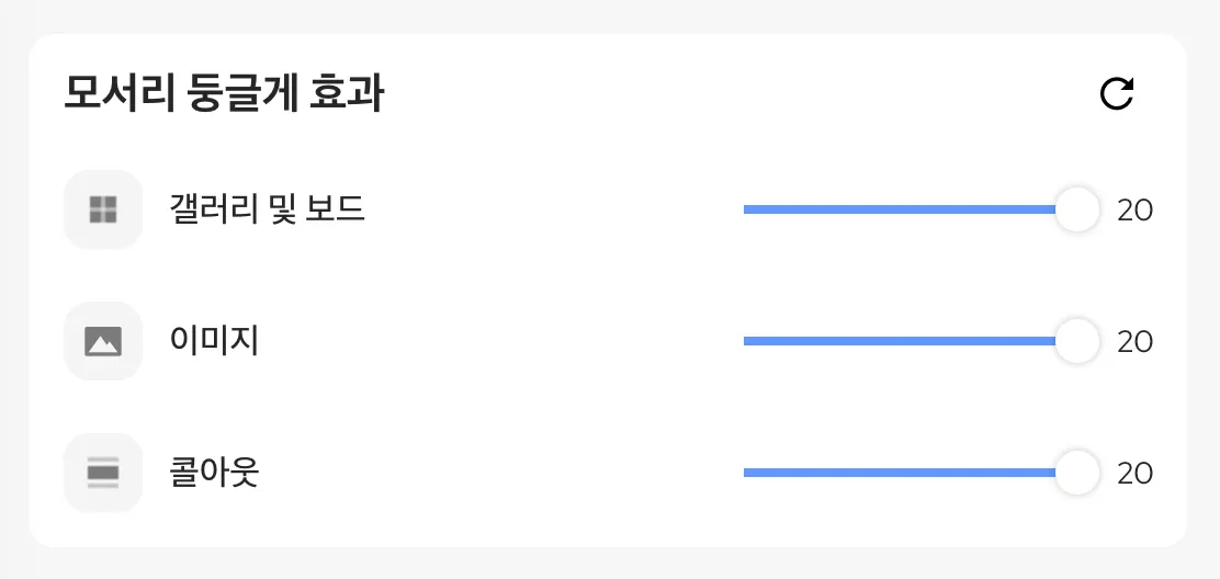갤러리 및 보드, 이미지, 콜아웃 모서리를 0~20까지 4단위로 적용시킬 수 있어요.