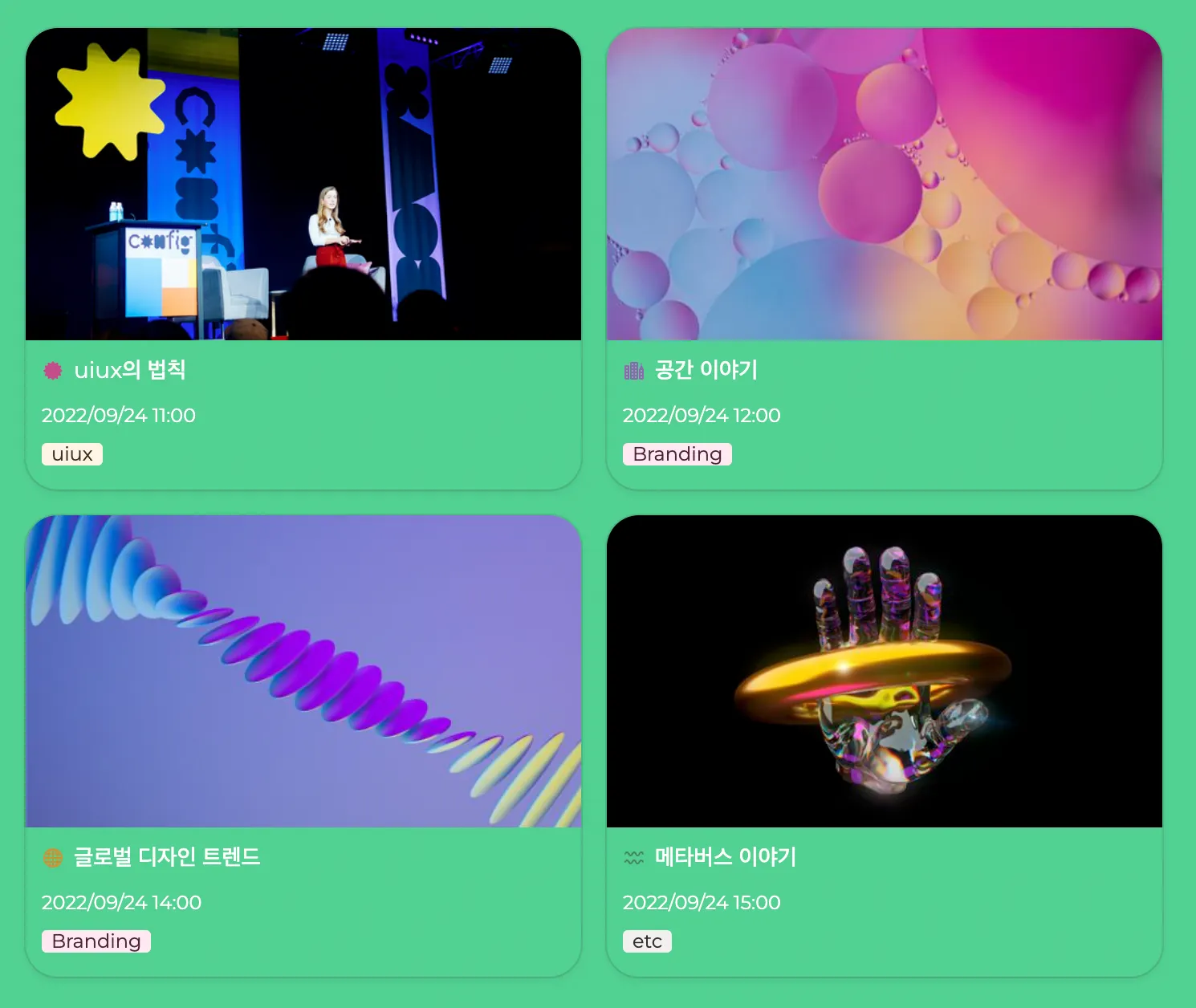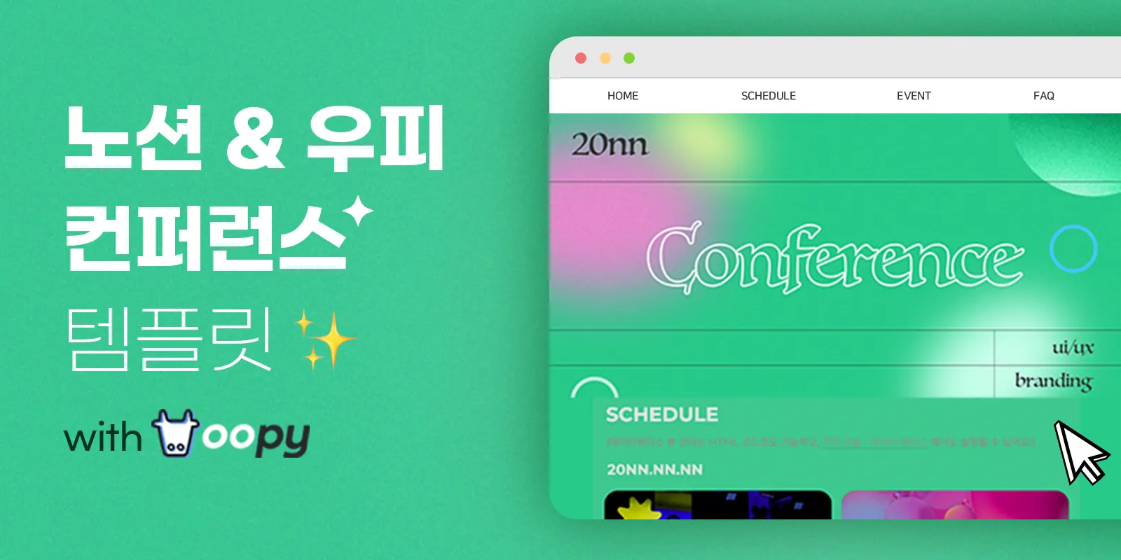 우피는 가상의 컨퍼런스 페이지를 제작해봤는데요, 컨퍼런스의 메인 컬러를 그린으로 잡아봤어요