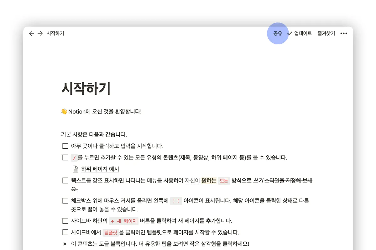 공유하고 싶은 노션 페이지로 이동해 우측 상단의 '공유' 버튼을 클릭해주세요!