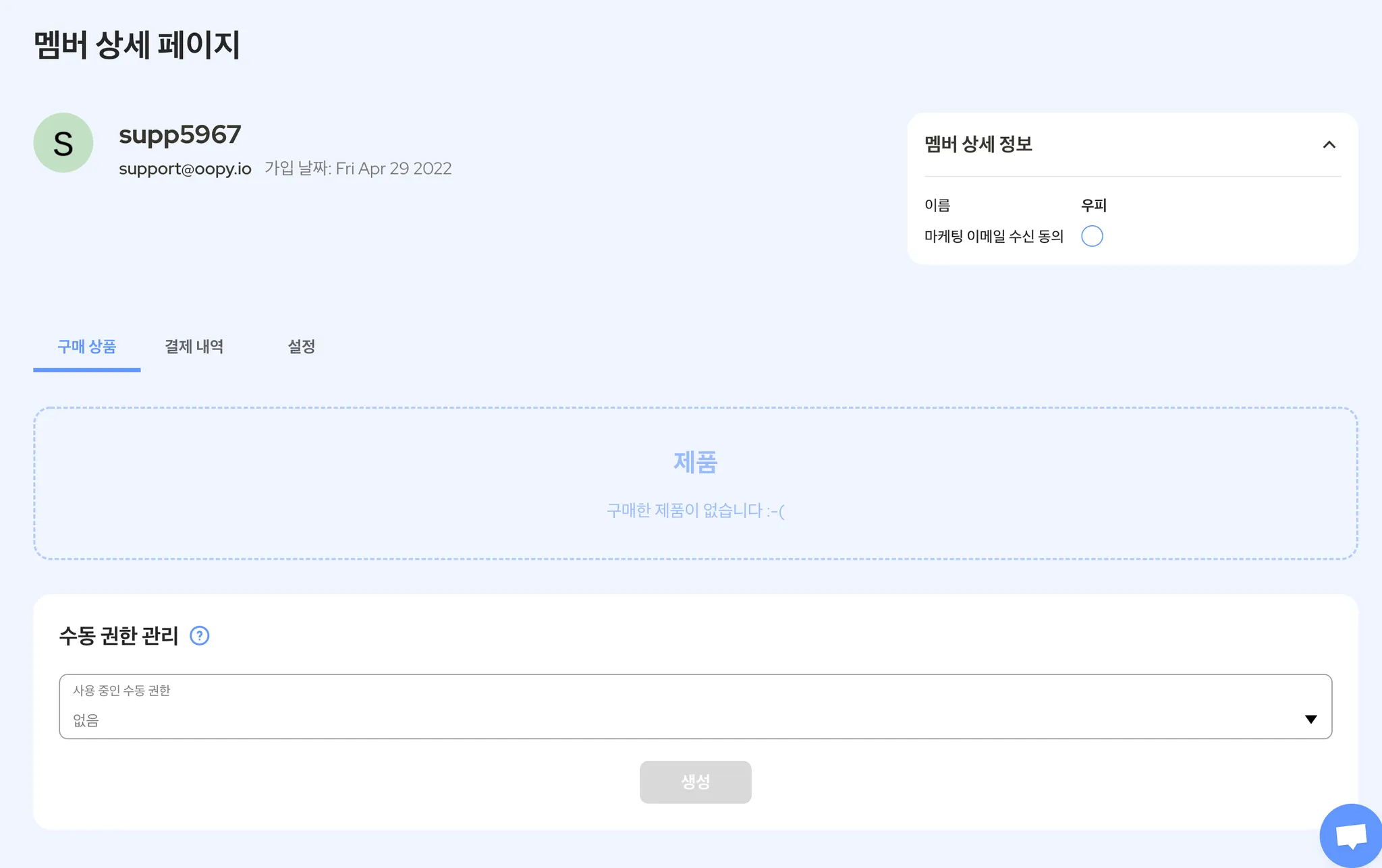 수동 권한 관리: 이 멤버에게 수동으로 권한을 부여하여 상품을 구매한 것 처럼 만들 수 있습니다.