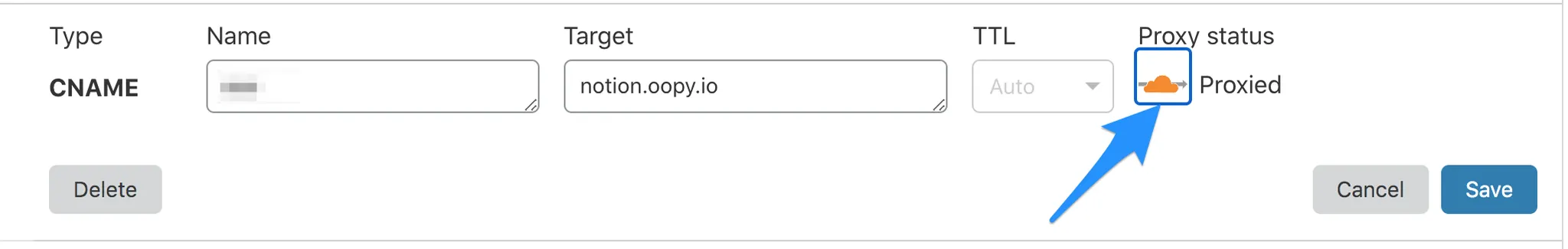 Set proper values. CNAME for Type, subdomain name that you want for Name (e.g. www) and notion2.oopy.io for Target. Please set the Proxy status to DNS only .