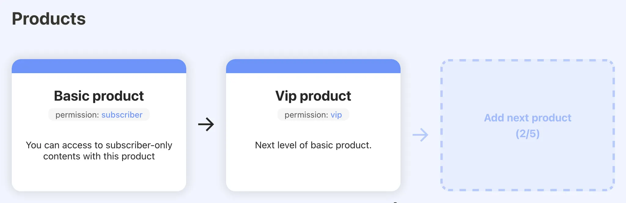For example with a case of above image, a member with 'Vip product' can get access to content of 'Basic product', but a member with 'Basic product' cannot get access to content of 'Vip product'.