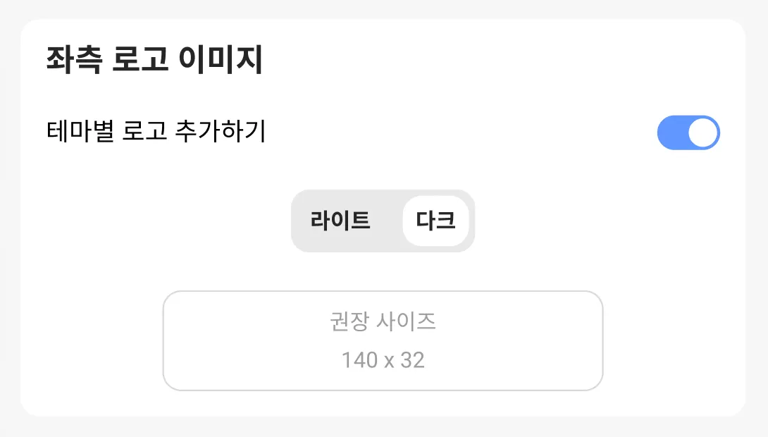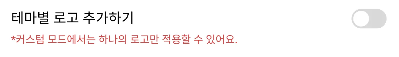 단, 커스텀 색상 테마를 설정하셨다면 1개의 로고만 설정할 수 있어요!