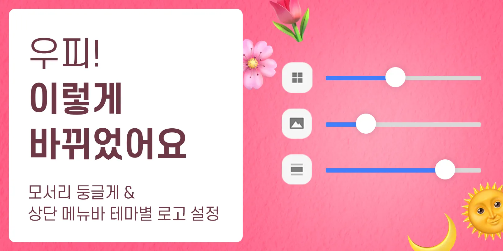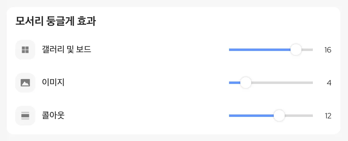 모서리 둥글게 효과는 갤러리 및 보드, 이미지, 콜아웃 총 3가지를 둥글게 조절할 수 있어요!