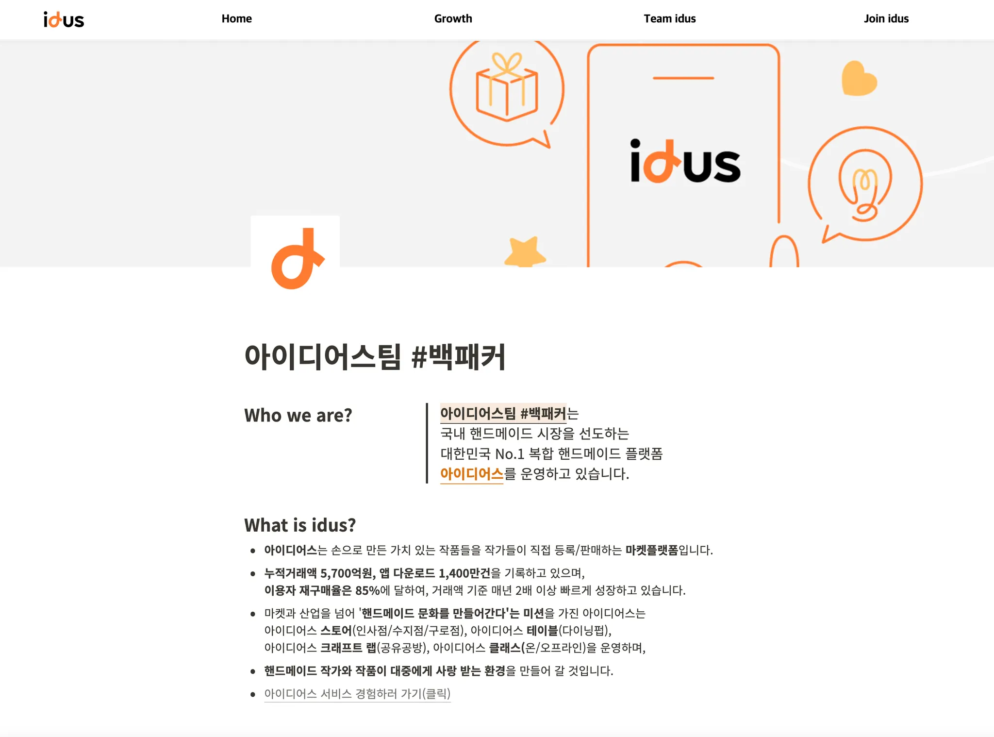 아이디어스 팀은 우피를 통해 회사 소개 페이지를 제작했다고 해요